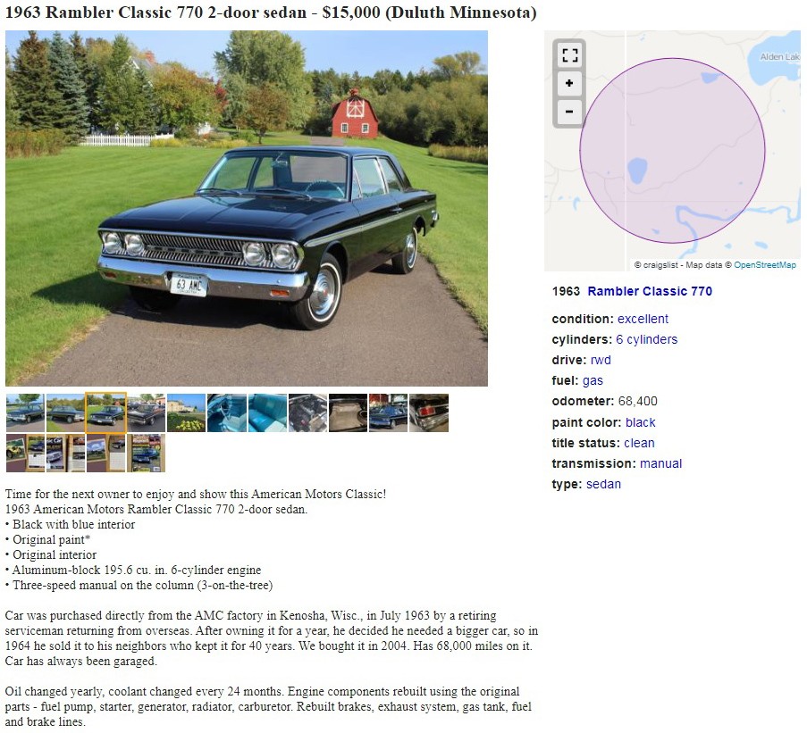 The seller of this gorgeous, has-to-be-the-nicest-one-left, 1963 Rambler Classic Six 770 2-Door Sedan says that it’s been featured in a book on AMC cars, it’s been in two national calendars, and has been in three magazines. I don’t know if these photos are from one of those appearances, but they sure look professional. They have it posted here on craigslist in Duluth, Minnesota, and they’re asking $15,000. Here is the original listing, and thanks to T.J. for the tip!