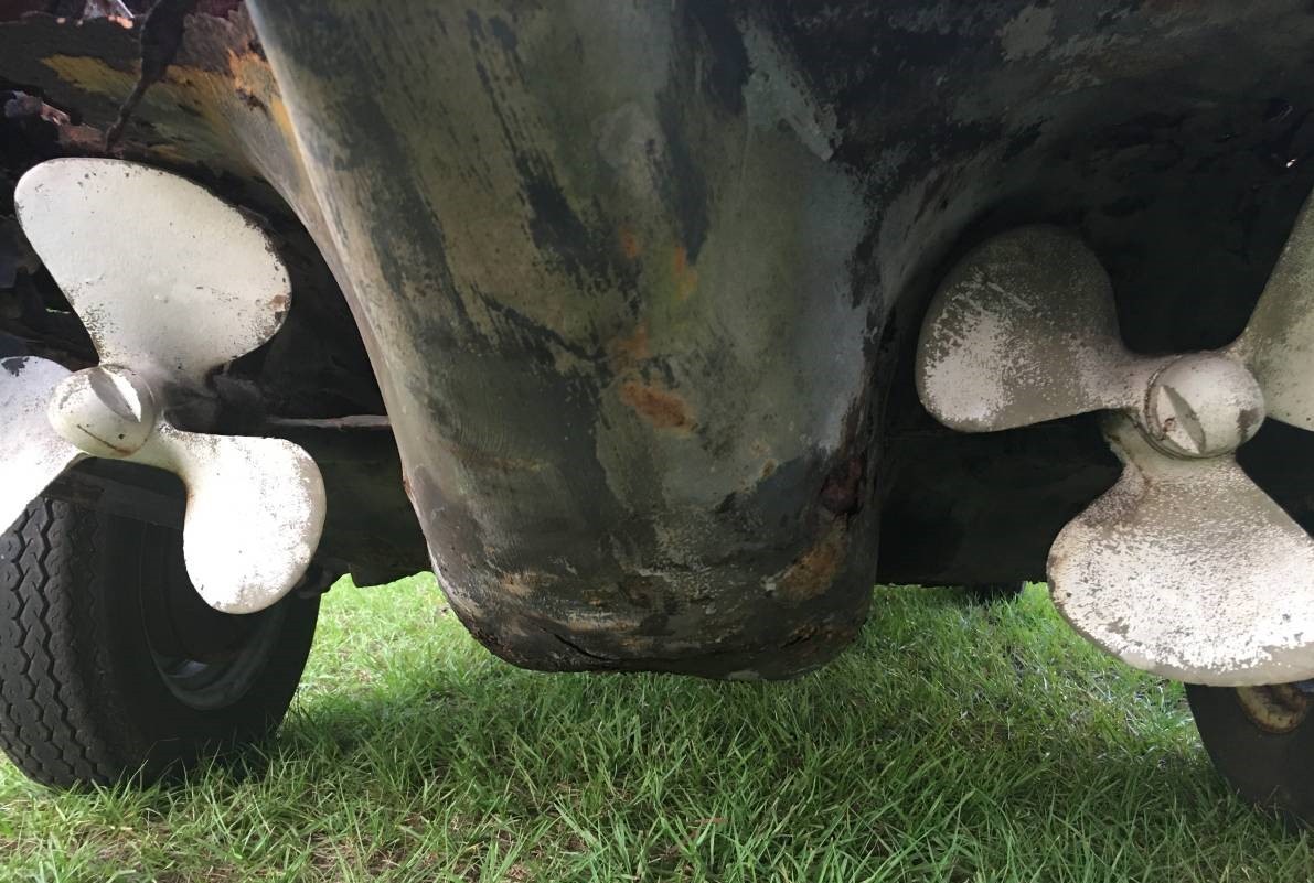 The engineering of these little swimmers was unique due to the need to function on both land and in water. The undersurface up front is slightly pointed and then sharply cut away. Wheels are set low so the vehicle stands well above ground level when on dry land. Water propulsion is via twin-propellers mounted under the rear bumper. And the body is made of steel rather than wood or fiberglass as with most boats.