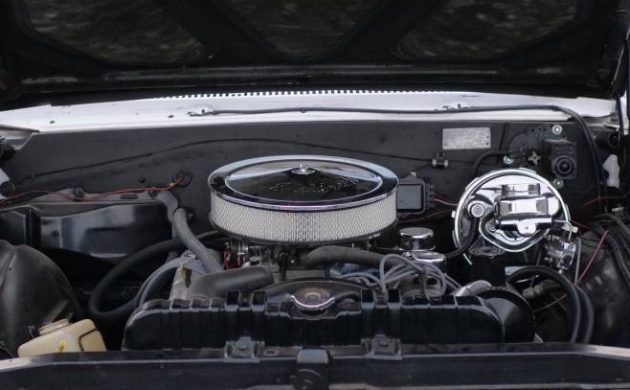 The red vinyl interior is very sixties GM. It’s a simple, clean environment, and in this case, it’s in like-new condition. Despite the buckets, there’s no center console, and the gear selector is column-mounted. The instrument panel is a study in simplicity; there’s no dash pad to worry about, and the carpet and door panels show perfectly. It’s not said if the upholstery is new or a redo; whatever the case, it hasn’t experienced too much top-down exposure.