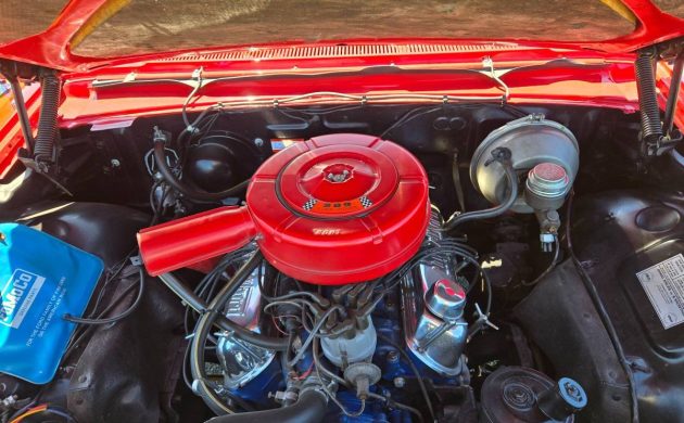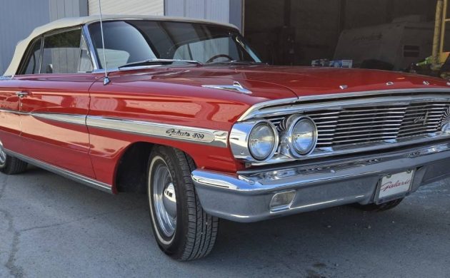 Wow! Beautiful convertible. Not sure of the actual dimensions, but the ’64 Ford seems so much longer that the ’63 or ’65. Especially in the convertible. Have to have either 1. a lot of time, 2. a lot of willing kids or, 3. a lot of money to keep it waxed. Not super crazy about the chrome/baby moon wheels. I had a set of the wire wheel covers Ford offered for ’64 on my ’59 Fairlane 500. I thought they were beautiful (but keep in mind I thought my Fairlane was beautiful, too). My ’59 was a 292 with a 3 speed on the column. Really wished it was a 352. Similarly, if this ’64 was mine I’d be wishing the 289 was a 390.