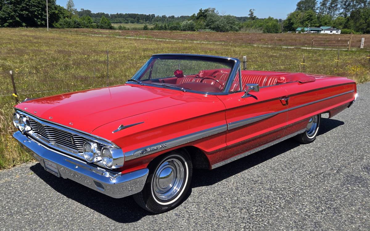 Wow! Beautiful convertible. Not sure of the actual dimensions, but the ’64 Ford seems so much longer that the ’63 or ’65. Especially in the convertible. Have to have either 1. a lot of time, 2. a lot of willing kids or, 3. a lot of money to keep it waxed. Not super crazy about the chrome/baby moon wheels. I had a set of the wire wheel covers Ford offered for ’64 on my ’59 Fairlane 500. I thought they were beautiful (but keep in mind I thought my Fairlane was beautiful, too). My ’59 was a 292 with a 3 speed on the column. Really wished it was a 352. Similarly, if this ’64 was mine I’d be wishing the 289 was a 390.