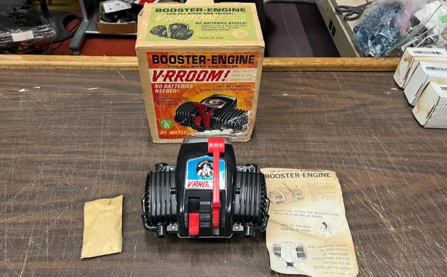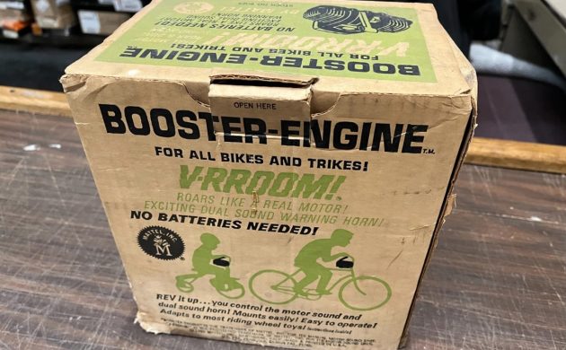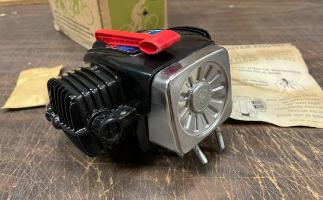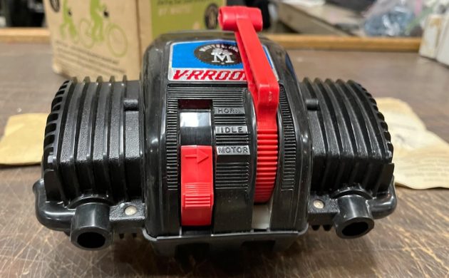 This “engine” is somewhat related to one I found a little over two years ago for a 1966 Mattel Stallion, and I paid almost $500 for that one in NOS condition. We saw that one attached to the restored bike here on Barn Finds on March 4, 2024. It doesn’t seem like it has been two years already. That V-RROOM! “engine” is powered by a couple of D-cell batteries, but this one is powered (the sound part, I mean) by pulling down on that red lever on top. It makes three sounds, the top is a whining sound, sort of like my normal voice, then there’s neutral, with no sound other than cheap plastic parts spinning faster than they should, and the bottom setting sounds like your stomach late at night after a stop at a gas station for a couple of roller dogs.
