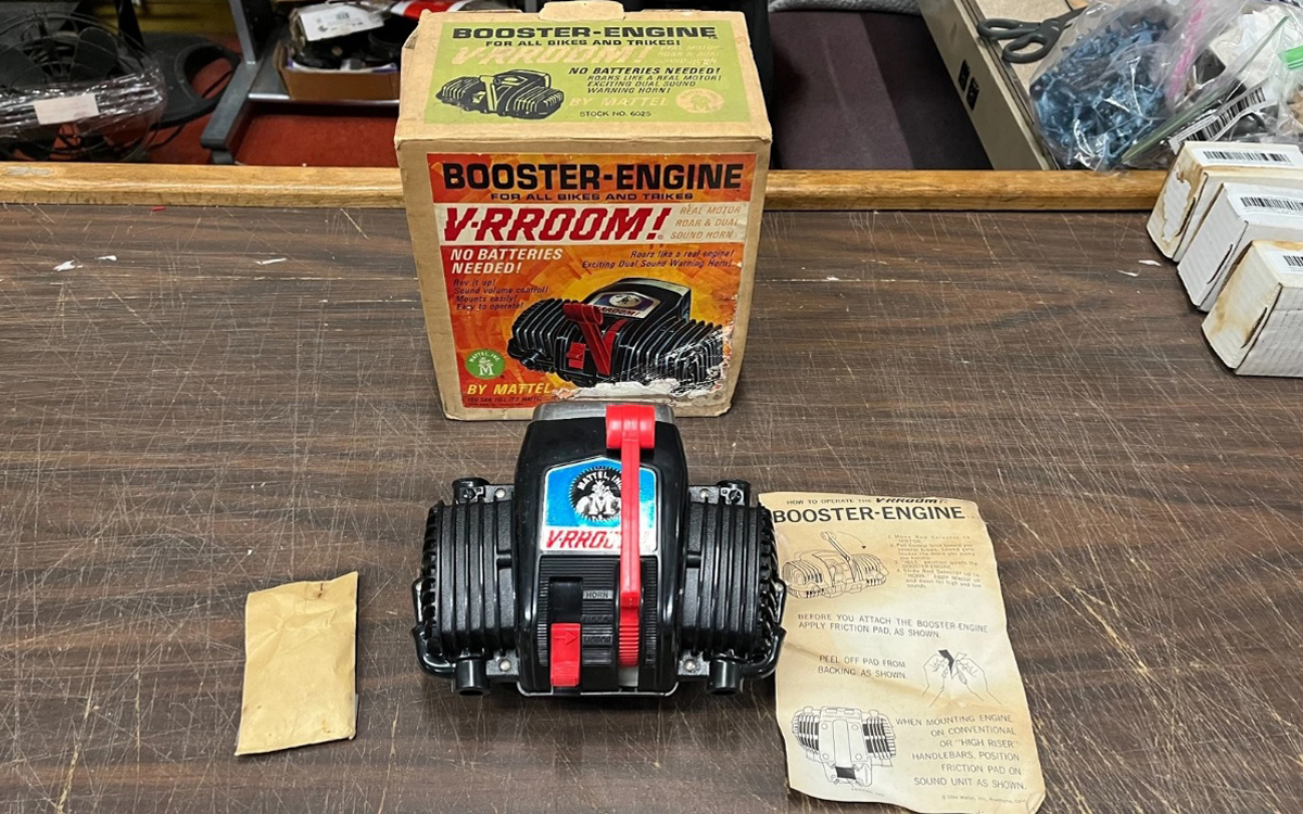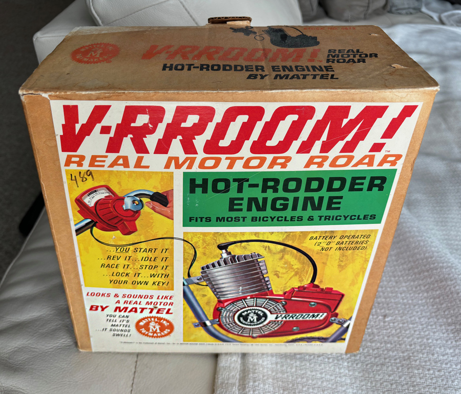 With vintage toys, the original box can sometimes double the value, or the asking price, if not even more than double, sometimes, depending on the artwork and rarity. This 1964 Mattel V-RROOM! bicycle booster “engine” (sound-maker) comes with its original box and instruction sheet, as you can see here on the eBay listing. It’s located in Butler, Pennsylvania, and the seller is asking $179.95. Thanks to PRA4SNW for the tip!