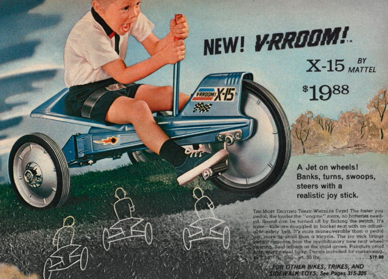 Mattel offered these plastic and metal (that’s an actual thin metal part that’s chromed) sound-maker motors/engines for its line of V-RROOM! bikes and other wheeled goodies in the 1960s, and they’re pretty fun. I cleaned up the one I just got with some soapy water and a toothbrush. Then I used just regular polishing compound, and it looks almost perfect, but I really want that box. Mattel made some very cool and heavy-duty bikes, and even a three-wheeler called the X-15, meant to get in on the space race. I have one of those, but it’s in line to be restored. I should have done that this winter.