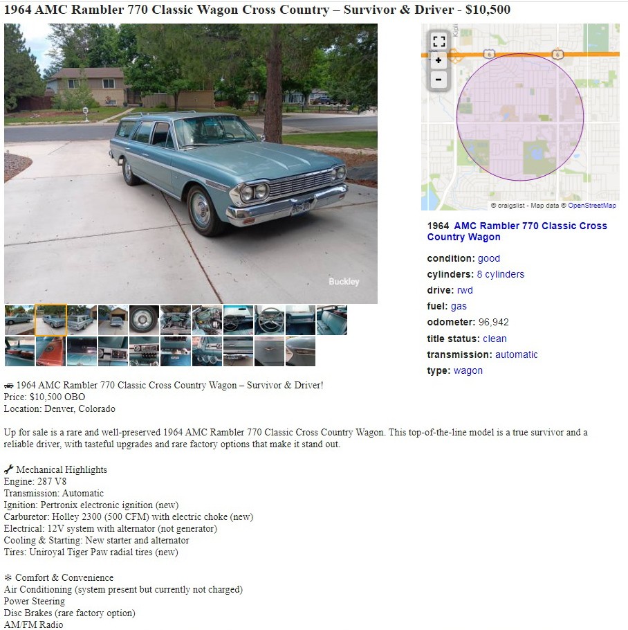 I wonder how many times any of us have said, “Wow, what a beautiful Rambler Classic wagon!” I’ve thought it and must have said it over the years as I’m a big fan of any AMC products. This 1964 Rambler Classic 770 Cross Country Wagon is on another level; this thing is gorgeous. The seller has it posted here on craigslist just east of Denver, Colorado, and they’re asking $10,500 or offer. Here is the original listing, and thanks to Mike F. for the tip!