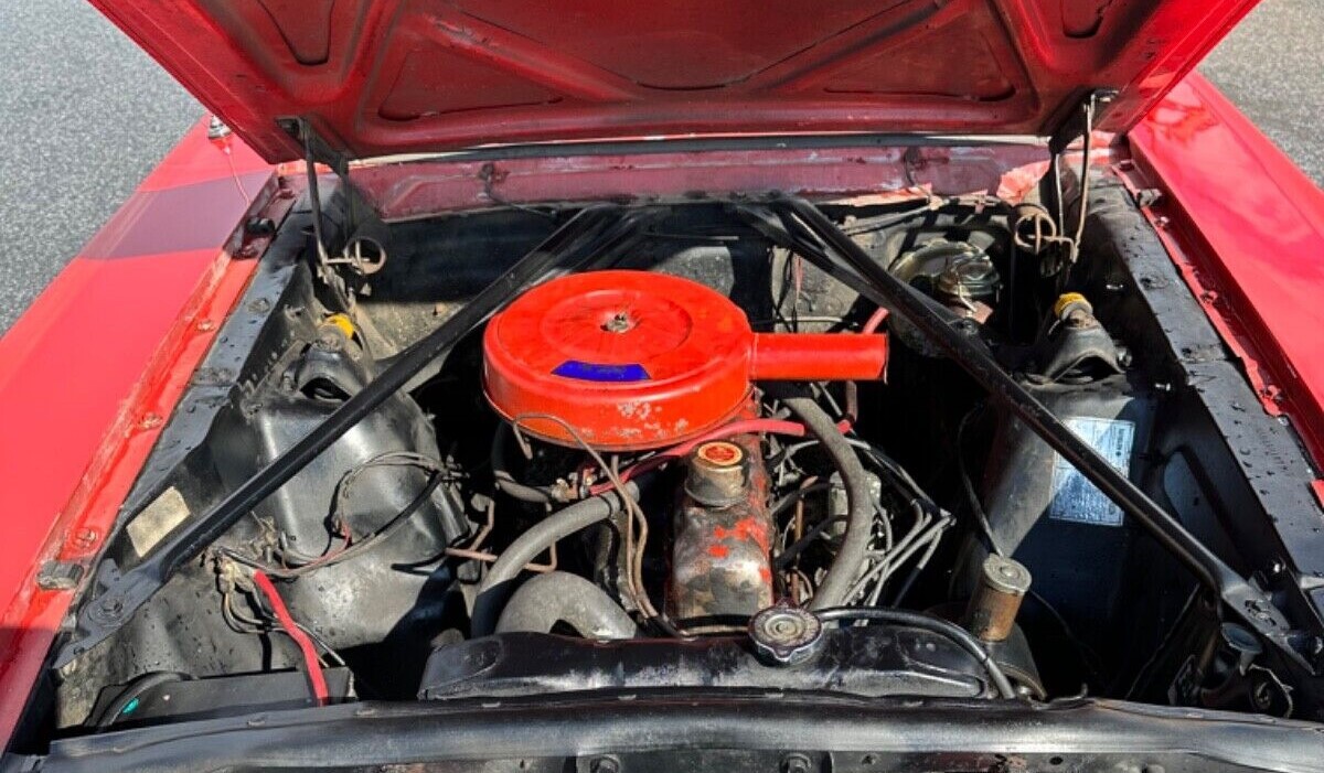 We’re told this ’65 ‘Stang was once restored and looks great now except in a few places when you get up close. There you’ll see a couple of little scrapes and bubbling where rust may be trying to break through. The Rangoon Red paint shines up nicely and the white top presents well, while we’re told the power mechanism to lower or raise it works as it should. The interior comes across as original and the red carpeting and seat belts are starting to fade.