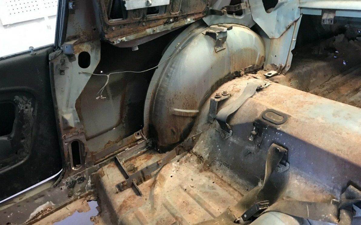 The interior is now the exterior as it has all been removed but the seller claims, “The interior is also complete with a fold-down rear seat and all the fiberglass pieces unique to a fastback. The only interior piece missing is a passenger seat, easily obtainable at your local swap meet. All the fastback unique brackets are still in the car”. That said, there is a massive amount of work necessary to repair the floors and structure. There is a partial image of the dash and instrument panel but there are no gauges or switchgear present so it’s a safe assumption that those parts, and all of the wiring, will have to be sourced.