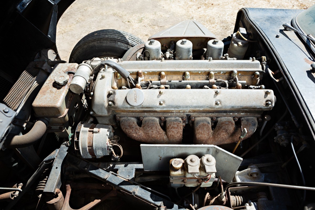 I wasn’t sure what to expect when we reached the interior of this Jaguar because the potential was there for significant deterioration after five decades in storage. However, what we can see looks enormously positive. The overall condition has undoubtedly been helped by the soft-top remaining intact because that has prevented dust, dirt, and other contaminants from finding their way into the car. It is upholstered in Black, and once again, the lack of surface corrosion is an encouraging sign. The dash is close to perfect, while the gauge lenses are clear and free from cloudiness. The wheel is a thing of beauty, and what can be seen of the seats and remaining trim suggest that the entire interior might respond exceptionally well to some careful cleaning and conditioning. To me, the dash of the Series I perfectly encapsulates the stereotypical appearance of a classic British sports car. The later vehicles featured rocker-style switches, but Jaguar produced these earlier cars with toggle switches. To me, they offer the perfect look in a car like this.