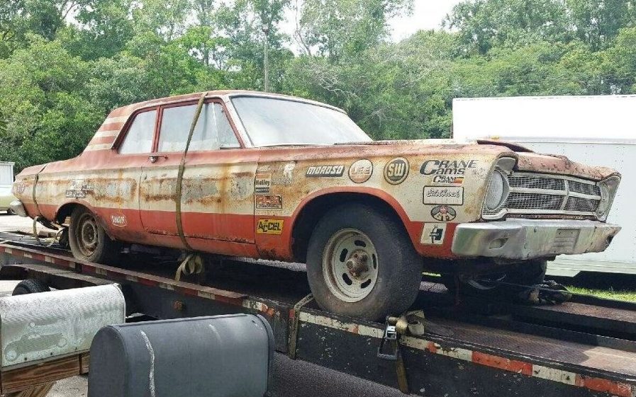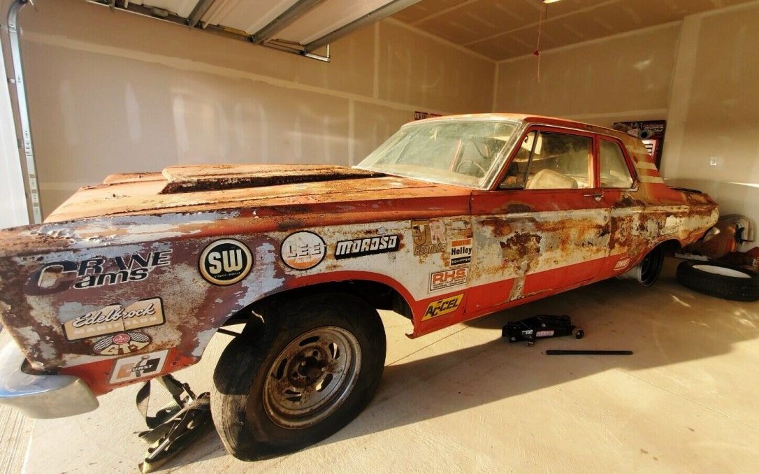 The paint scheme looks like a cross between a Ramchargers and Butch Leal car. Unfortunately, it looks like it’s pretty far gone.