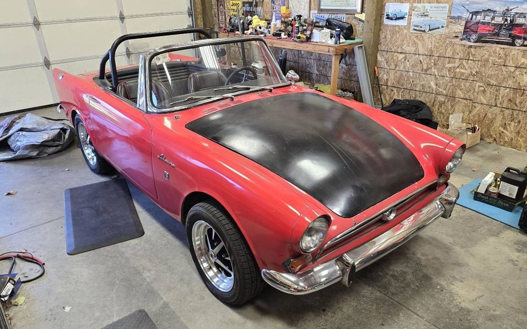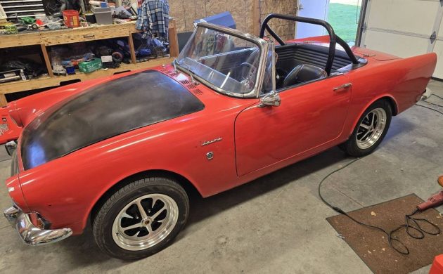 There’s not much Sunbeam left in the powertrain, since the rear end is a narrowed nine-inch (Ford?) unit. The car has front disc brakes, a factory hardtop (not shown), and redone seats with new custom wheels and tires, a custom exhaust with a header pipe, and a nice wood dash (with a missing glovebox). There’s a rollbar, too. It’s unclear if the car has a soft top, because it’s not shown. The body looks very clean, and these cars rust a lot.