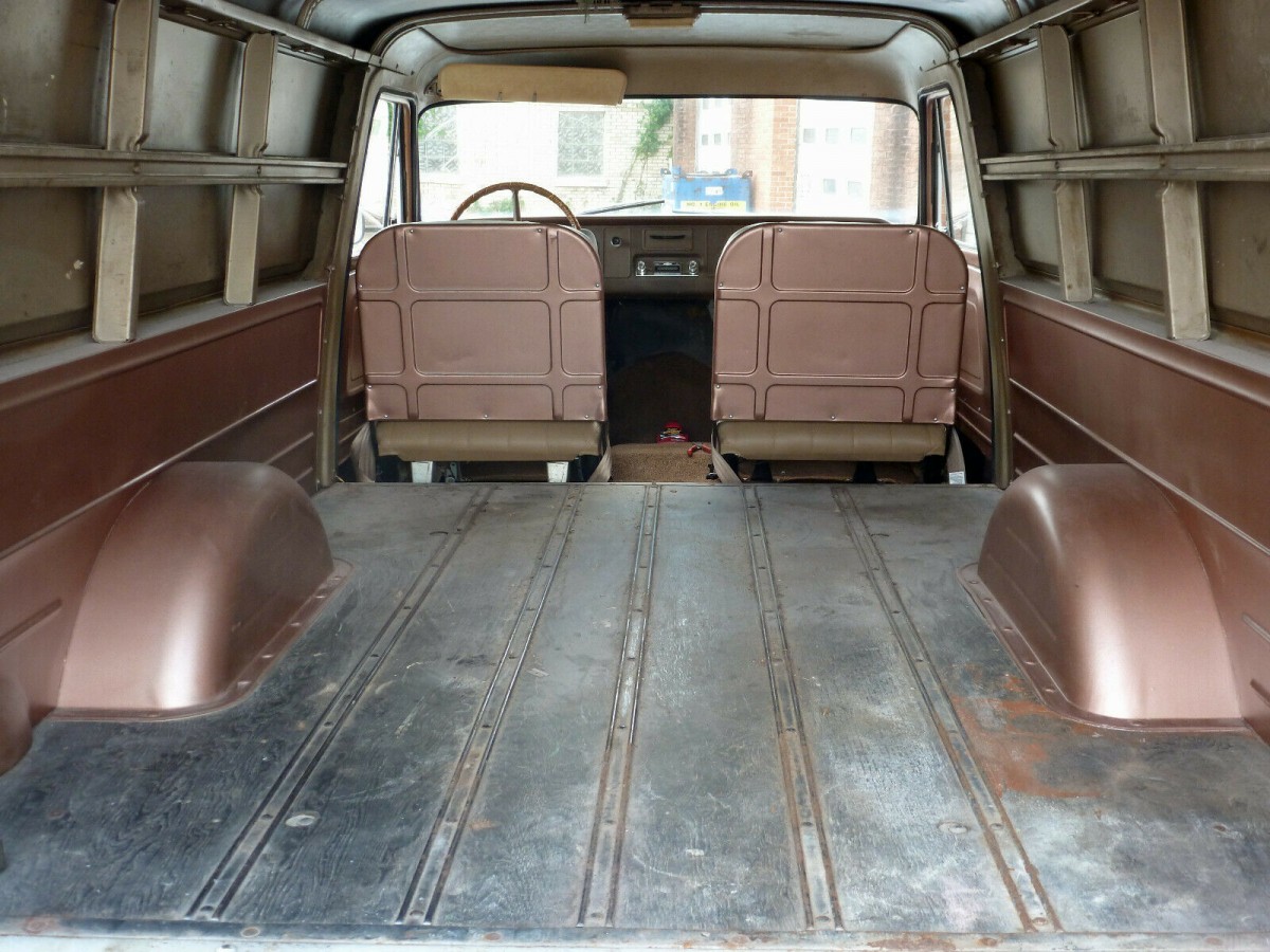 Even better, the seats were recovered, new carpeting installed (to replace ragged rubber mats), and seat belts—which it probably didn’t have originally. The interior looks quite nice. The cargo floor is painted black, but there’s wood under the paint so it could be stripped and stained.