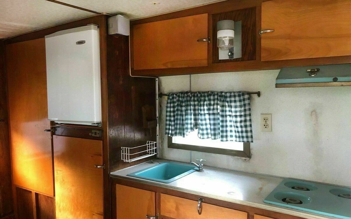 The interior looks pretty good although, sadly, the roof leaks in a few spots so that’ll have to be fixed ASAP. They don’t show any photos of the bathroom and in my world, there are never enough photos for online listings. I don’t get that but it’ll never change so I have to get over that mental hurdle… somehow. In any case, this really looks like a super cool and unique camper. Have any of you seen one with just the front clip and no pickup doors like this? Any guesses as to what the camper manufacturer was?