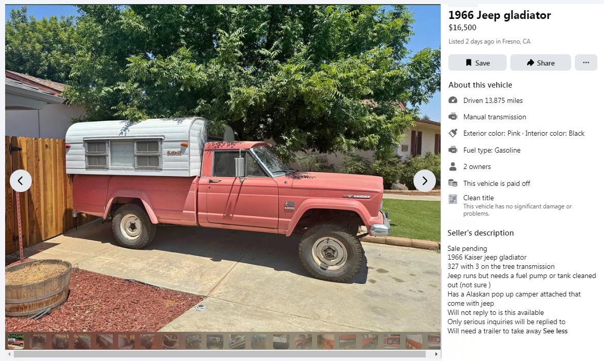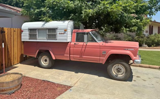 Is this faded Indian Ceramic? It looks almost like a Mary Key Jeep, and even though I’m not a big pink vehicle guy, I like the look. I’d instantly move to New Mexico if I owned this rig; it would fit in perfectly there. This 1966 Jeep J-3000 Gladiator 4×4 with an Alaskan pop-up camper can be found here on Facebook Marketplace in Fresno, California, and the seller is asking $16,500. Here is the original listing, and thanks to T.J. for the tip!