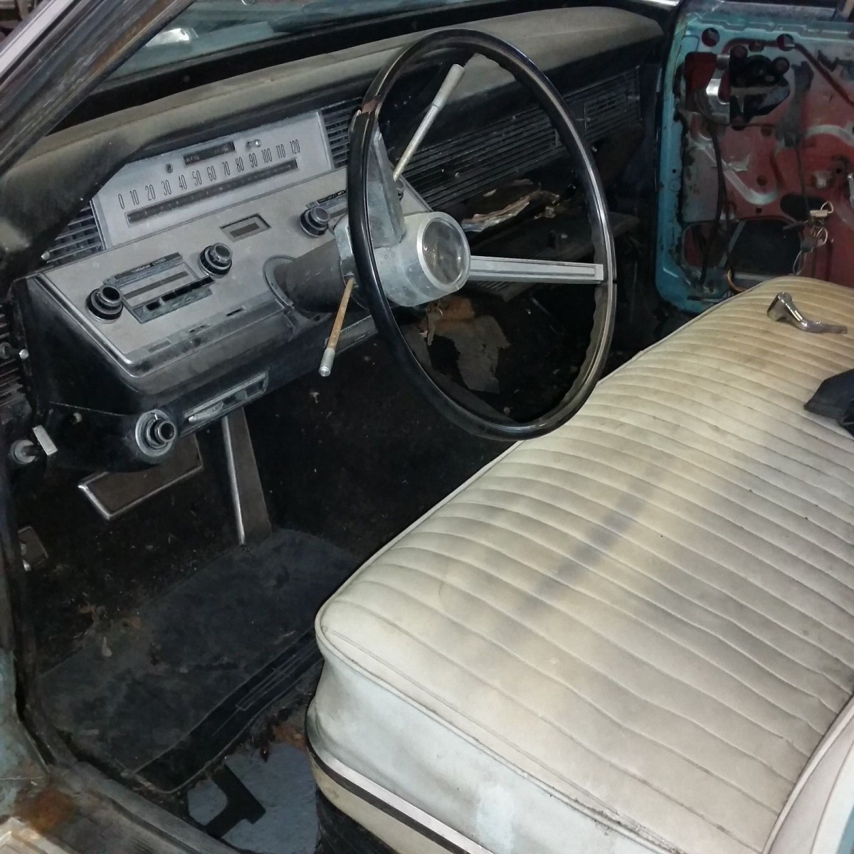For the 1966 model year, the original 430ci MEL V8 engine was expanded in capacity to 462ci, and that is what is fitted to this car. After dragging the car from its resting place, the owner discovered that the fuel line was rusted out under the car. He connected an external gas can direct to the carburetor, and that old V8 coughed right into life. This is the area that best demonstrates the fact that the owner has some confidence about the viability of the car as a restoration project. Since he got the car running, he has fitted a new alternator, a new battery, new plugs and wires, and new tires.