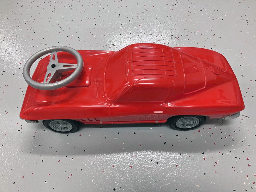 This Corvette promo model, as with most of them, was made by AMT (Aluminum Model Toys) out of Troy, Michigan. In the mid-1950s, the company found success in making 1/25th scale models of new cars based on actual manufacturer drawings and clay models in a bigger scale, which were then reduced to 1/25th scale. Sales departments would use the models to market their lineup to folks who couldn’t make it to the dealership to see cars in person. They were plastic, as is this car, and there were many vehicle makes and models made over the 1950s through the 70s, mainly. This car is likely around 8″ or so.