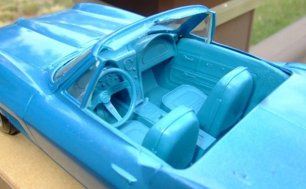 Hmm, I have a ’63 split window Corvette Sting Ray by Monogram. I think the box says 1/8th scale. It’s all there. The box top is a little caved in and one of the serrated corners is separated from years in the attic and having stuff on it. Medium blue in color, something like ’68 Chevrolet Marina Blue. I was passing a table at a swap meet a few years ago, saw the same model as mine when I overheard the guy say to someone else, $200.