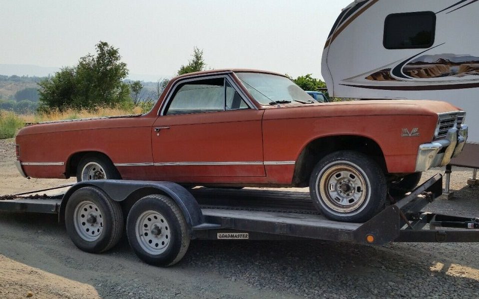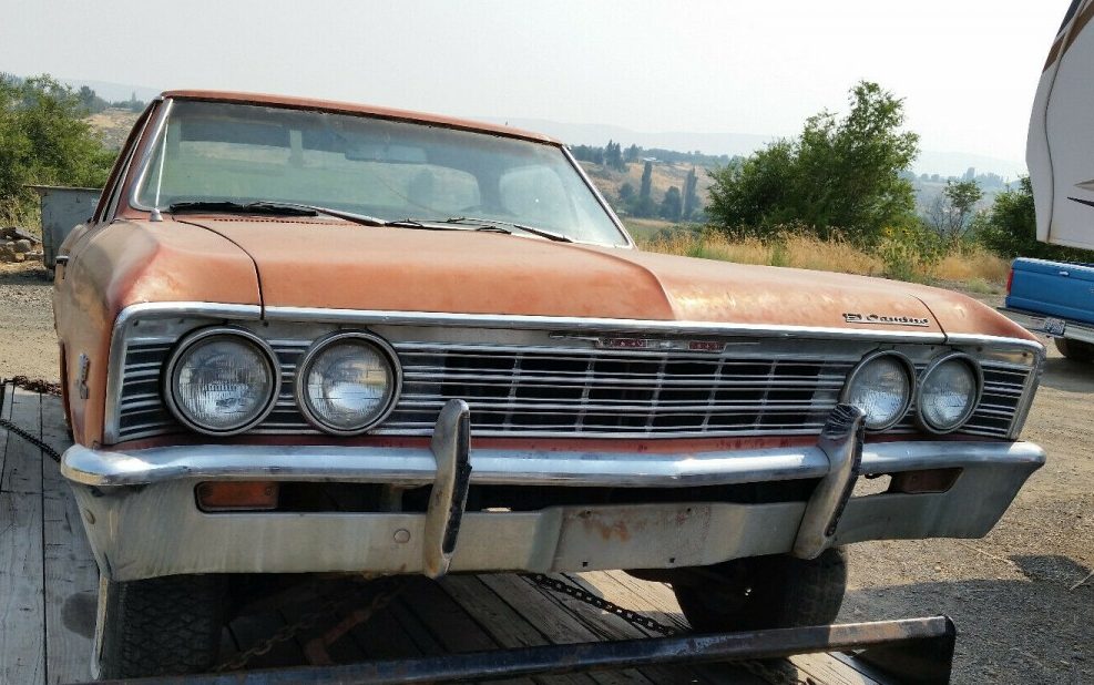 I have a knack for stumbling upon cars in pieces. I don’t know why as I would probably be reluctant to take on such a project. Yet still, I find poring over the pieces and thinking, “Hmmm, what if…” and I guess that’s addictive. So continuing with my mild obsession, let’s examine what I would call “muscle truck potential” in the form of a 1967 Chevrolet El Camino. Besides being in pieces, it’s in Yakima, Washington and available, here on eBay for a starting bid of $5,000 and a BIN price of $12,500. Thanks to Barn Finder extraordinaire Larry D for this tip!