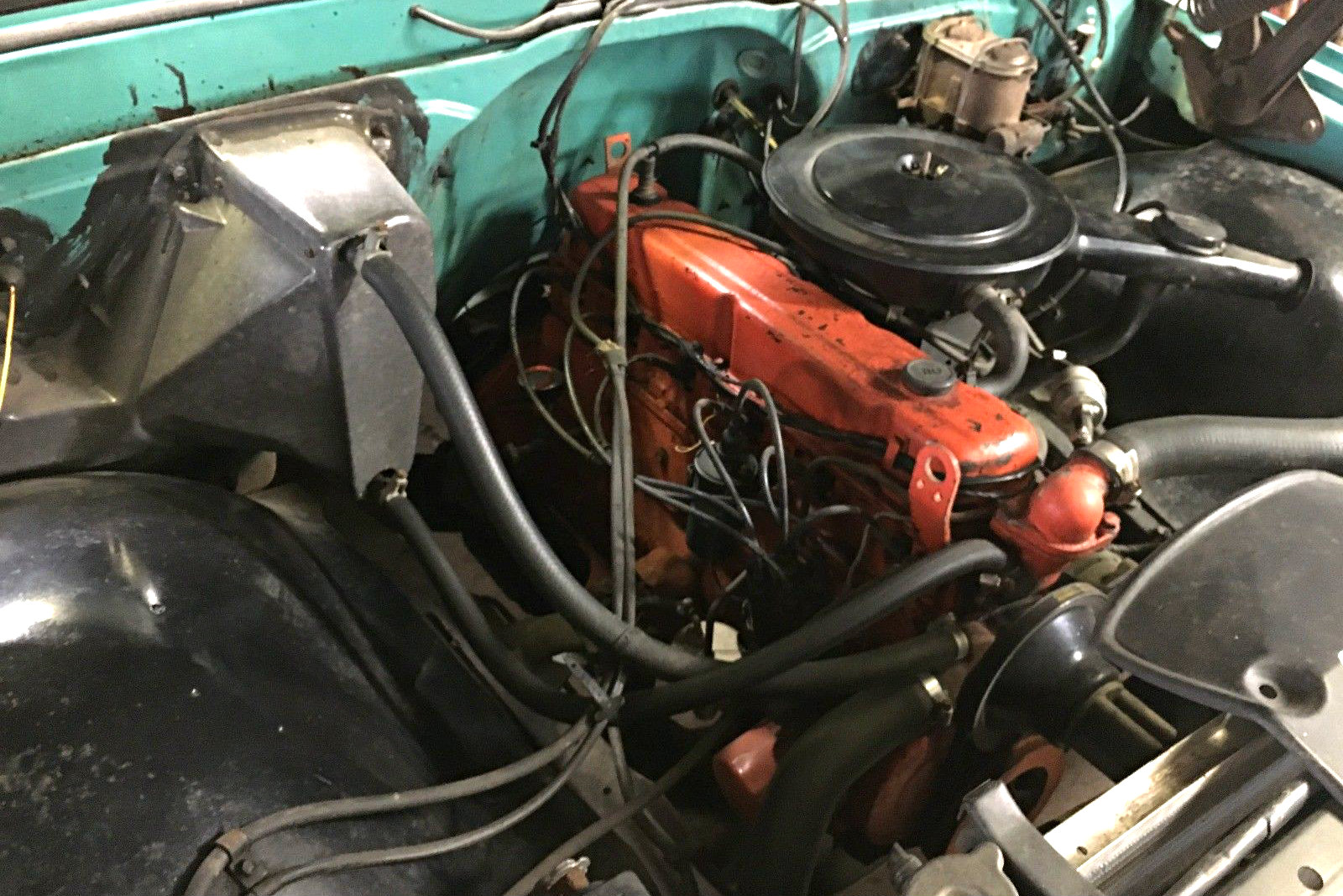 Like an ocean of sea foam green, the interior is in fabulous condition and certainly looks new. There are a few wrinkles here and there on the bench seat, and the steering wheel is very nice, but still has a crack or two from aging. The gauge cluster panel is crisp and clean, and the needles on the gauges are not faded. Overall this interior is a real gem.