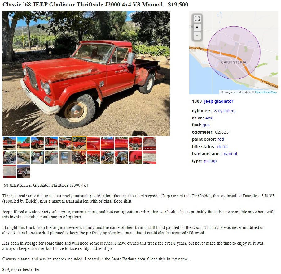 Before you get out the torches and pitchforks concerning the “350 V8”, thinking it’s just another restomod with a Chevy 350 in it, Jeep really did offer a factory 350-cu.in. V8 in the form of a Buick-sourced Dauntless 350 V8. Just as there was a Buick-sourced Buick Dauntless V6 in the Jeepster. The seller has this 1968 Jeep Gladiator J2000 4×4 Thriftside posted here on craigslist in beautiful Carpinteria, California, near Santa Barbara, and they’re asking $19,500. Here is the original listing, and thanks to T.J. for the tip!