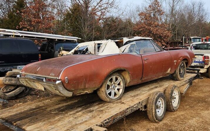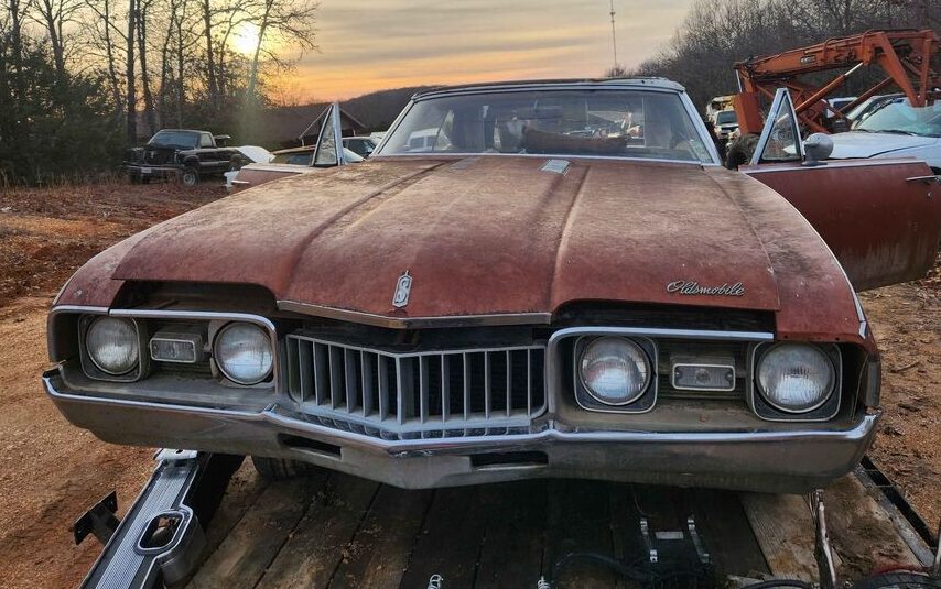 “You know how it goes” is the tagline that the seller of this 1968 Oldsmobile Cutlass convertible proclaims in its listing. Actually, no, I don’t know how it goes because it doesn’t look like it goes at all. It’s actually a candidate for my “What in the Sam Hill happened here” award. Rough is the word that describes this car best but it actually has an interesting configuration and an interior that I can’t take my eyes off of – more on that to follow. Located in Taneyville, Missouri, this Cutlass ragtop (literally!) is available, here on Facebook Marketplace for $5,000. Thanks to Gunter K for this tip!
