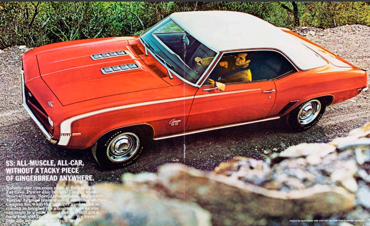 The 1969 Camaro received its first (and one-year-only) styling refresh since being introduced in 1967, and Chevrolet truly embraced the stronger aspects of the car, giving it more curves and a refined, muscular shape. As the ad said, “…as close as you can come to a pure sports car and still get a back seat and trunk in the deal.” Targeting like that helped the Camaro team escape the wrath of the Corvette loyalists!