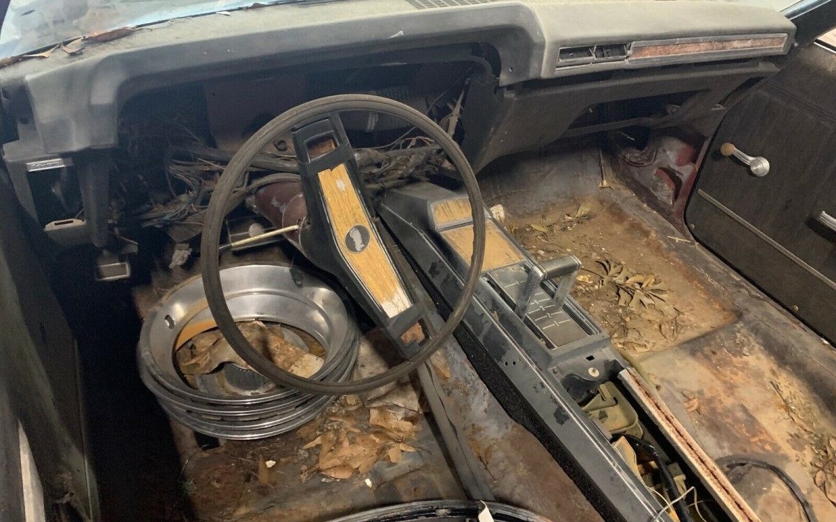 The interior is mostly complete, but it is lacking the seats and gauge cluster. The seller says the floor pan has been replaced, but it may have been a while ago. You can also see leaves on the floor indicating the car may have spent some time outside.
