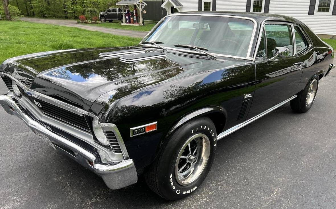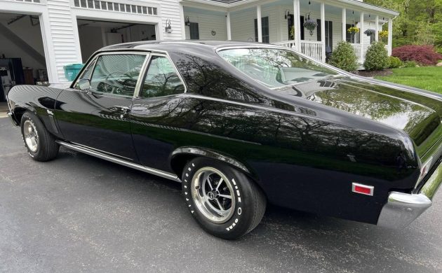 The rotisseries restoration on this Nova has just been completed. All the sheet metal is new except for the roof and body shell. Everything lines up properly, with new shiny black paint at every angle. The seller apparently spared no expense, as even all the chrome and stainless trim pieces are new, too, as is all the window glass. Work didn’t stop there as all the suspension pieces fore and aft were new, too.