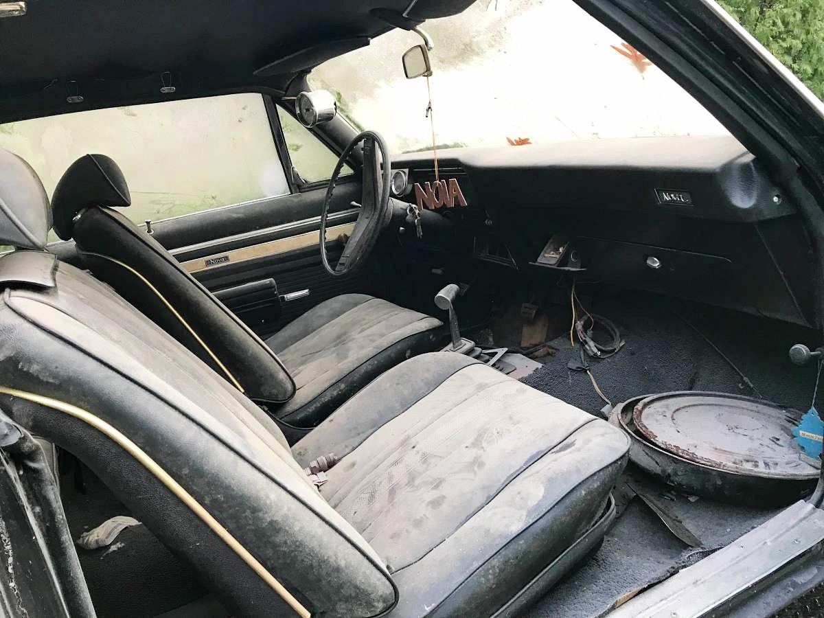 The interior is just as dusty as the outside, which helps with the claim of being in a barn for 30 years. The bucket seats are present and appear to be in good shape, although it’s hard to say for sure given all the dust on them. The shifter appears to be an aftermarket piece and someone added two gauges to the dash. A good cleaning would go a long way to helping find this Nova a new home.