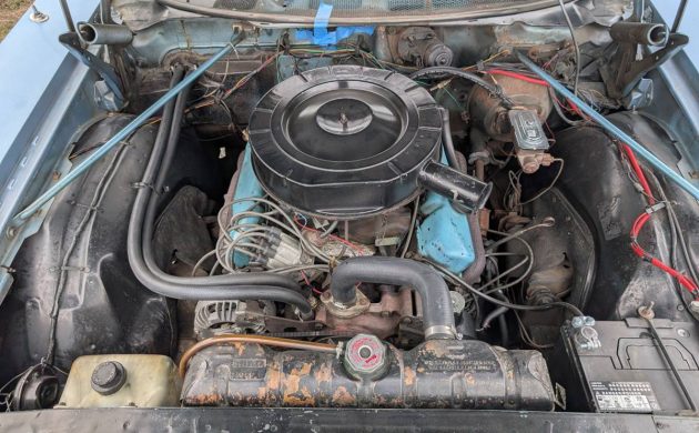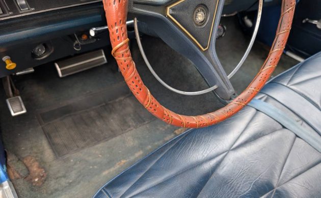 This one is equipped with Chrysler’s 383-cu.in. OHV V8, and I believe it’s the two-barrel carb (a four-barrel was optional), which had 290 horsepower and 390 lb-ft of torque when new. Passing through a TorqueFlite automatic, they say it “runs and drives,” which isn’t super confidence-inspiring, but at least it runs and drives. The engine compartment looks good to me, other than the blue tape. I’m not sure what it’s for, and there appears to be some blue paint sprayed in that area onto the wiper arms. Any thoughts on this Newport?