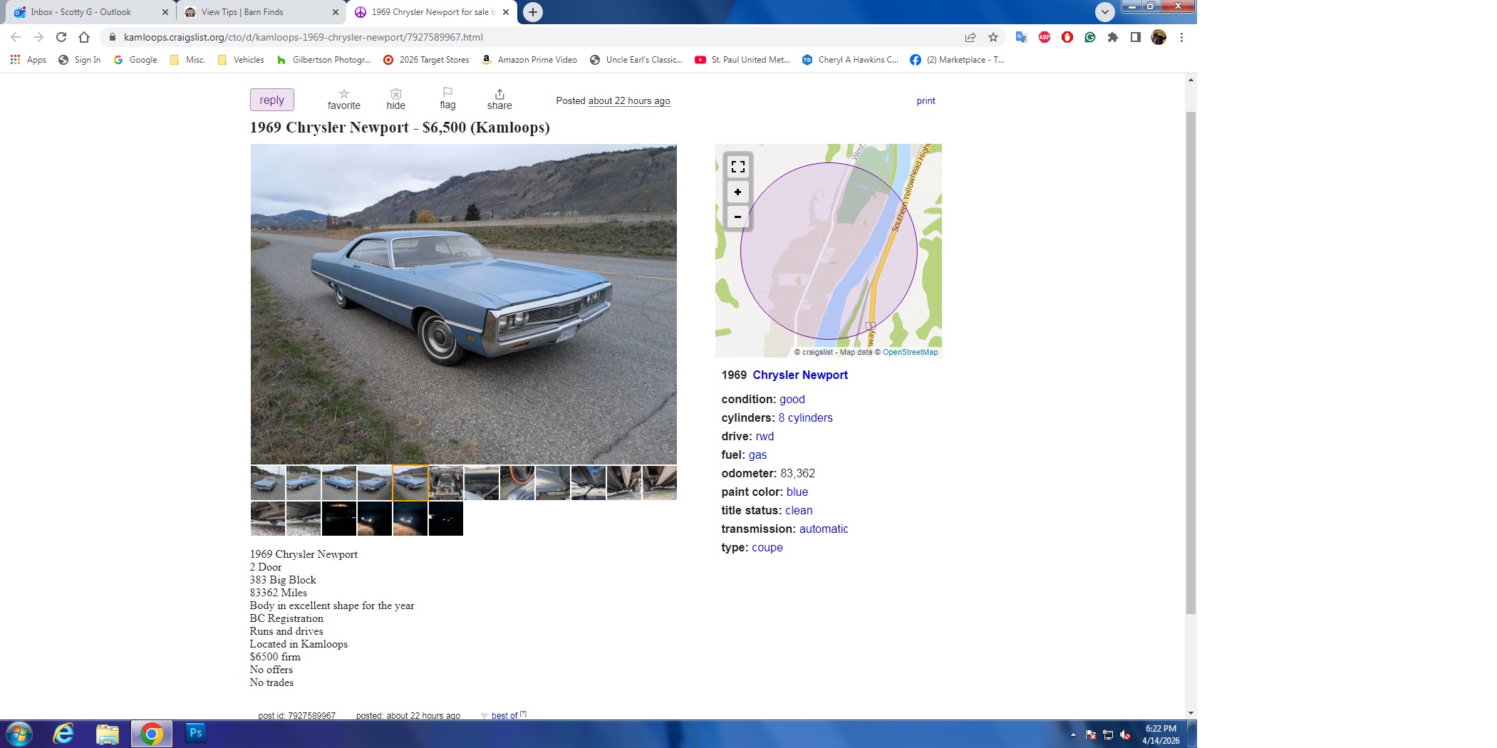 Bahama Blue Metallic is a gorgeous color and fitting for a vehicle located this far up in equally gorgeous British Columbia, Canada. This 1969 Chrysler Newport 2-Door Hardtop is posted here on craigslist in Kamloops, British Columbia, Canada, and they’re asking $6,500, which I’m assuming is Canadian dollars. If so, that would be $4,719 in U.S. funds. Here is the original listing, and thanks to Tony P. for the tip!