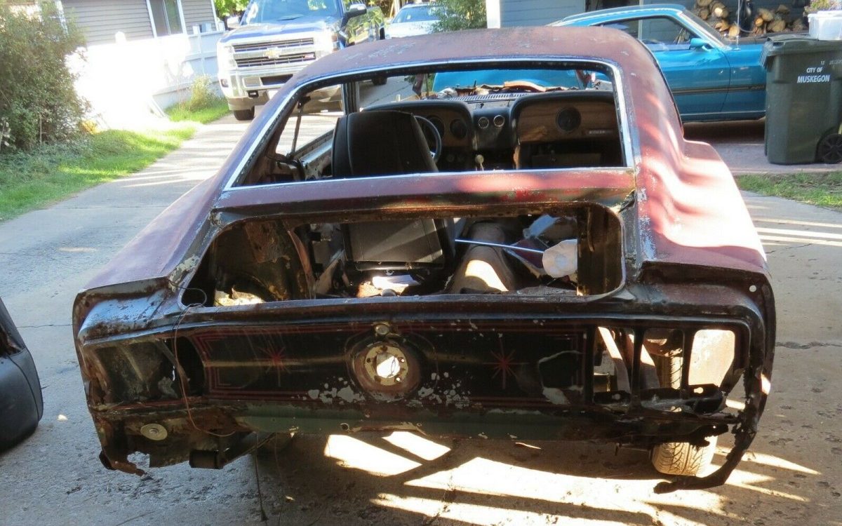 While the Mach I rolls, it does not have a steering box. The engine block, transmission, and front seats were said to be stored inside. A rusty rear axle with a Ford 9″ rear end is included with the sale. The frame rails are rusted through along with the floorboards and quarters. The seller will include a good hood and trunk lid.