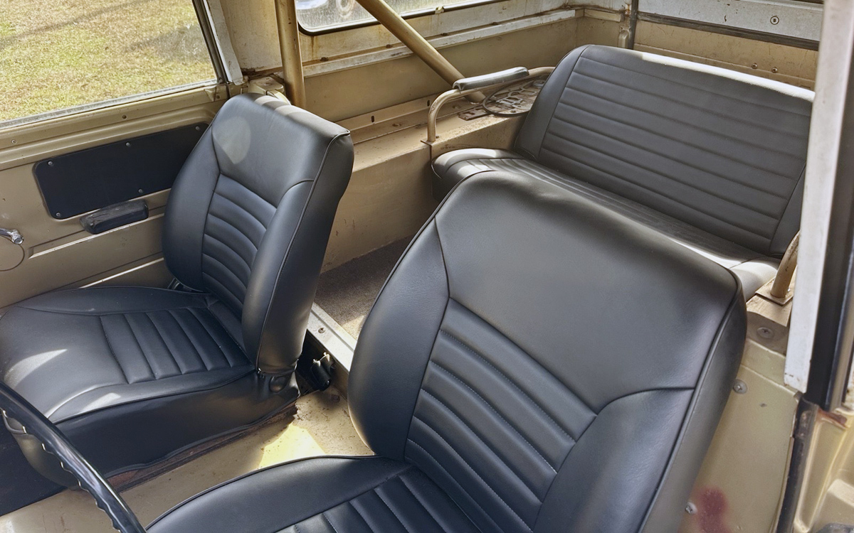 The seats have been recovered, and they look great, or at least look perfect. I would have liked to see a more factory look, or a more nubby, fine-woven-type vinyl, or even, gasp, a period-correct fabric, but that’s just me. I’m into vehicle interiors, as you know. They’d work for now, or forever. You can see a third pedal there; this Scout has a Borg Warner T-18 four-speed manual. Next to it is the single lever for the two-speed constant-mesh transfer case. The back seat cover is also new, and the rear cargo area is filled with stuff. I’m not sure if those are extra parts, manuals, or what they are.