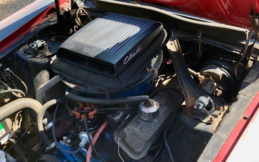The interior looks great with the faux teak trim and pleated vinyl, high backed, bucket seats. The dash pad is cracked though and will need attention. Tinted glass, PWR disc brakes and AM radio were also spec’d out. A Hurst t -shifter tugs at the 4-speed close-ratio tranny, which is connected to a 3.50 rear. All this is mentioned in the Marti Report.