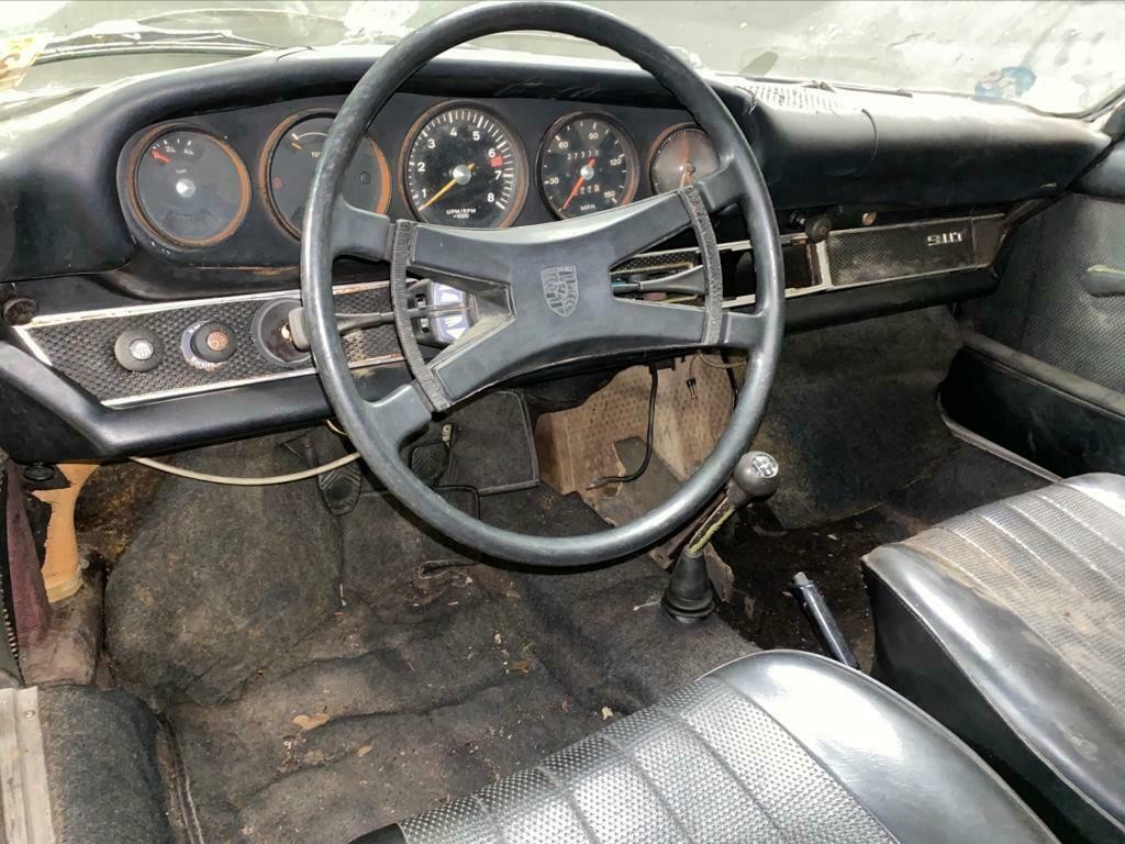 The Texas license plates may suggest long-term living in a dry, desert climate, but the 911T now resides in Orange, California, with a dealer called Gallery Junction. The 911 looks surprisingly straight once fully removed from the garage, with no major evidence of damage that typically originates from long-term storage. No cracked lenses or windshields, no fenders with huge dents from falling paint cans. The matching hubcaps and sugar scoop headlights are original items.