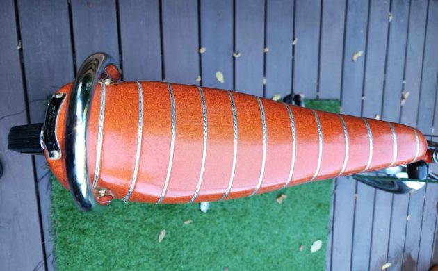 The rear derailleur on this Orange Krate lets us know this is not a mere single-speed economy bike for economy-minded parents to buy their kids, but a true five-speed. The details are great on this bike. The rear tire isn’t exactly a “gripper-slik” tire like this, but it’s close enough. A white-letter tire would be nice if a person owned Amazon or Tesla or were otherwise a devil-may-care billionaire with enough time and money to either search the globe for one or have one custom-made. Speaking of money, this bike was $93.95 brand new in 1969, and the asking price is about 35 times that. Above inflation for sure, but not that much more than the rise in Hemi Cuda values, or other similar muscle cars.