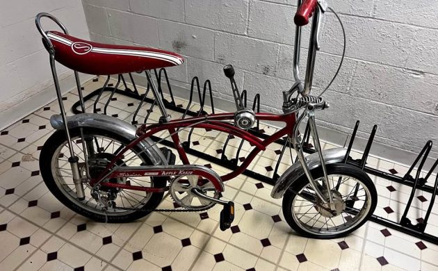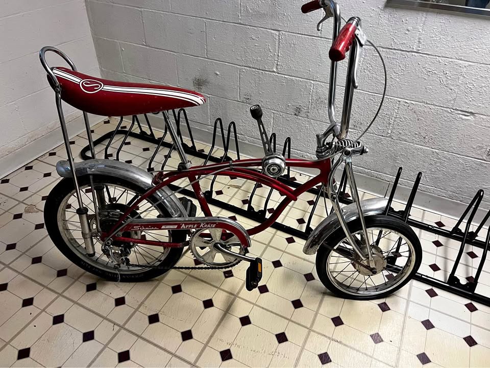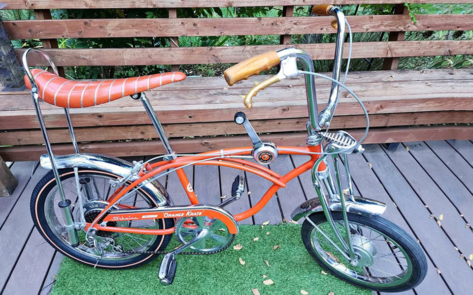 My brother had an Apple Krate, it was stolen and the perp had to buy my bro a bike, which wasn’t a Krate since they were sold out. He ended up with a 16 inch 3 speed Stingray Runabout ‘folding bike’, quite a let down. I made a replica Apple years ago, collected and restored some bikes, my collection includes an original rough Orange Krate, a Lemon Peeler Coaster Krate, a Stingray Runabout, a 1972 Apple Krate with disc brake,(My bestie) and a reproduction Pea Picker.I also have other balloon tire older bikes, the highlight being an original 1958 Schwinn Black Phantom. Oh, also a Raleigh Chopper 3 spd Mk II, and a very rusted Mattel Stallion.