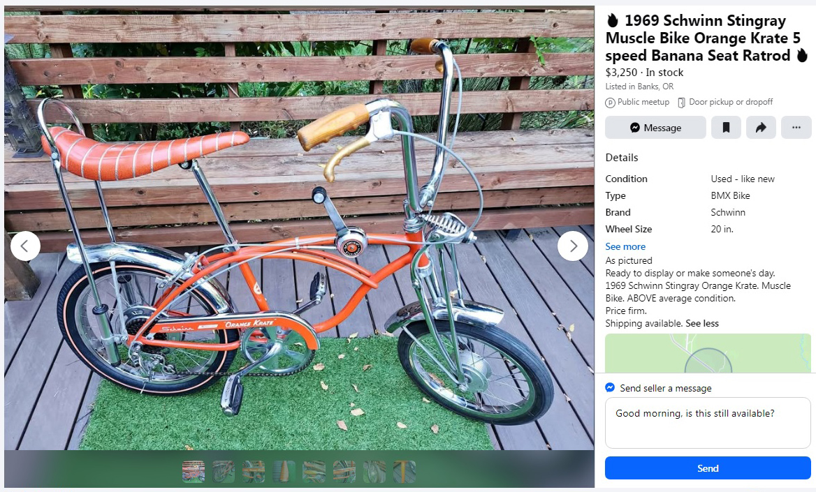 The seller doesn’t say whether this fantastic Orange Krate 5-speed bike is original or if it has been restored, or a combination of the two. Whatever its current condition is the result of, it looks outstanding and, as weird as it sounds, seems a bit cheaper than usual. This 1969 Schwinn Sting-Ray Orange Krate is listed here on Facebook Marketplace in Banks, Oregon, and they’re asking $3,250, firm. Here is the original listing, and thanks to T.J. for the tip!