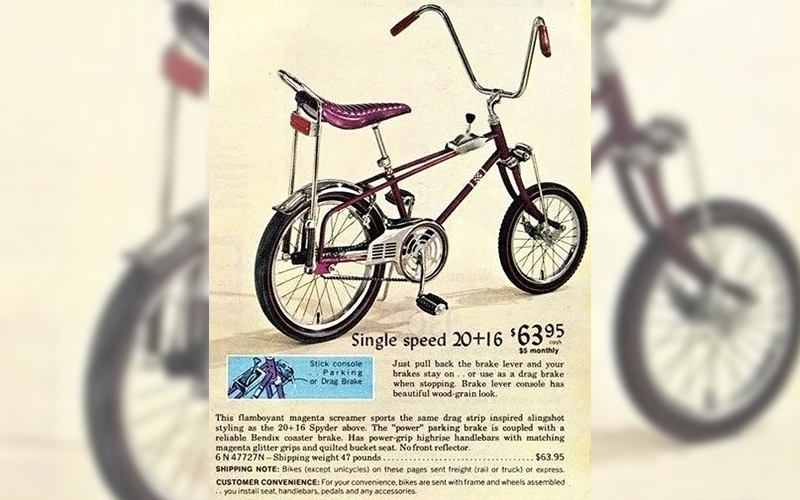 A kid in the subdivision got one exactly like this new-slick back tire, the whole Marianne. Suddenly he was the talk of the block and then all the boys were suddenly sporting ape hangers with banana seats to be cool..