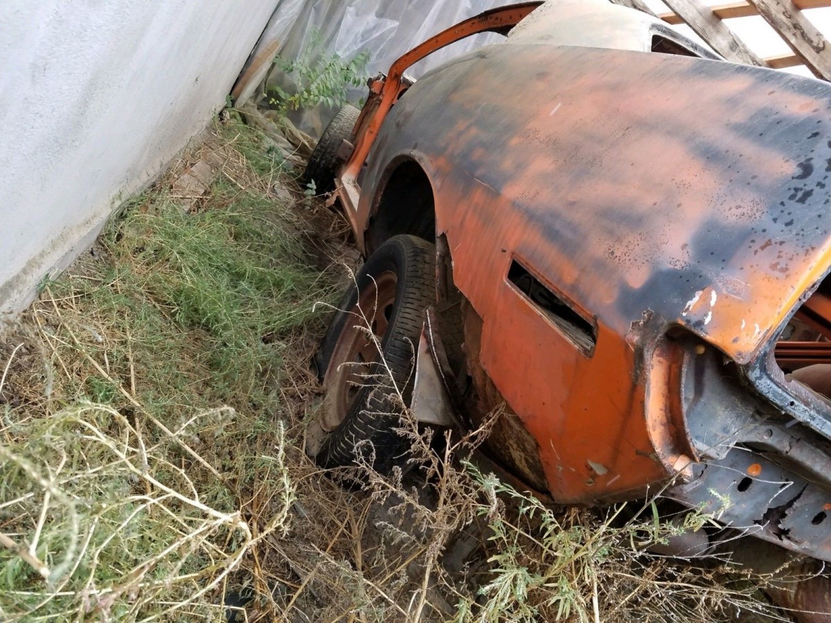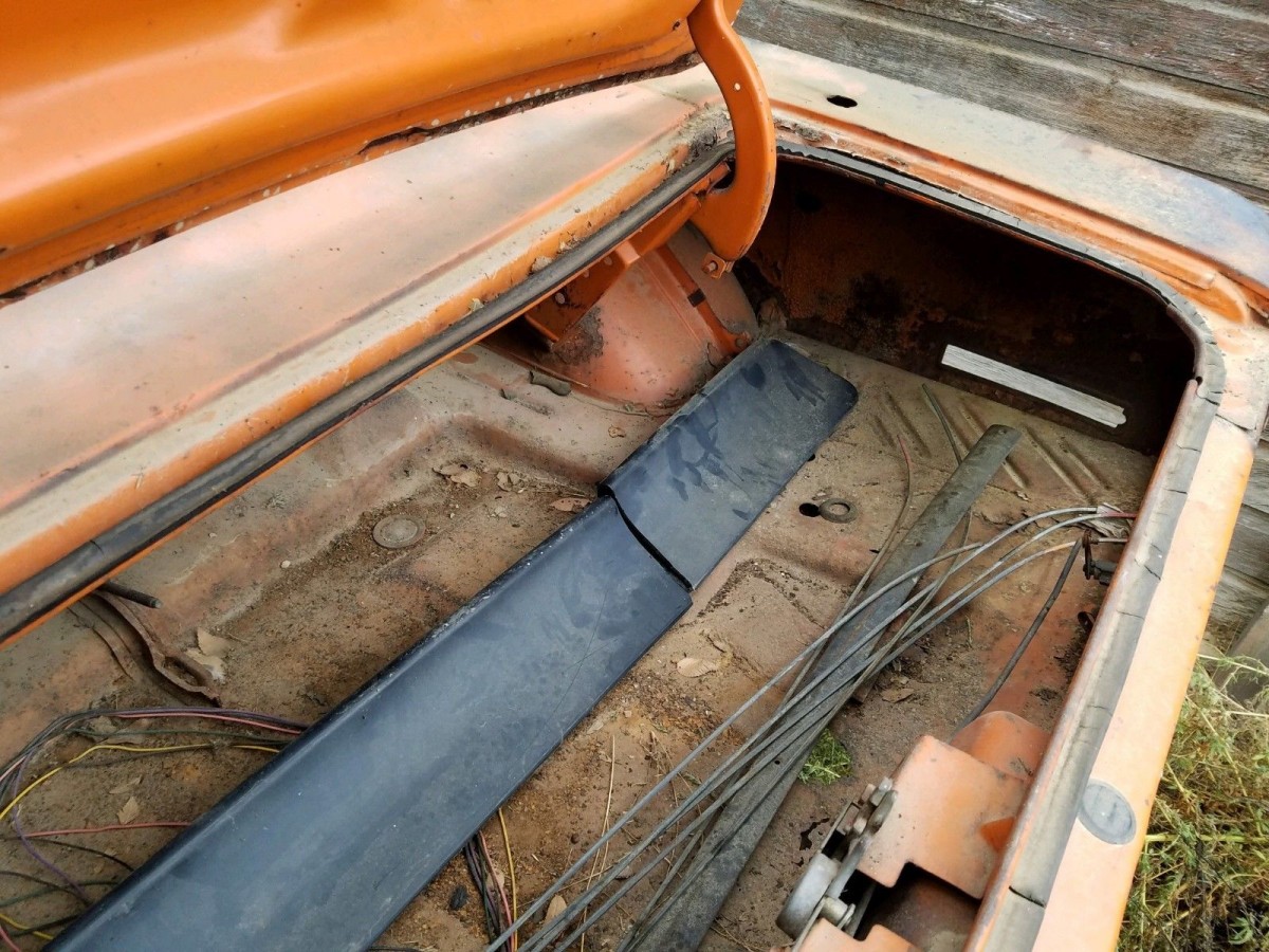 I was actually surprised to see this much trunk floor in place. That broken spoiler didn’t make me feel good but there is a second one pictured in the auction listing that is intact. There’s also the rare AAR hood but it is damaged slightly.