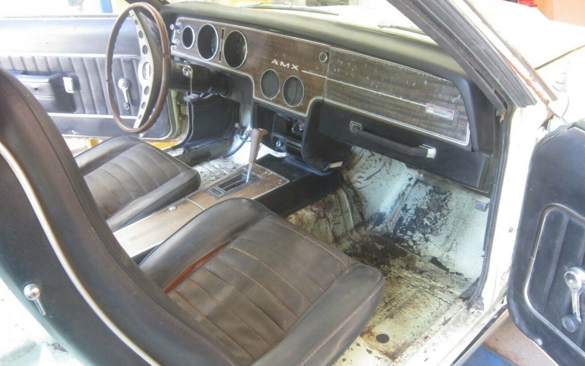 Those who like interior work should enjoy this project. While the AMX was only a 2-seat car, those 2-seats are not in great shape. The seller removed the carpet to clean the floorboards and has not replaced it. What’s left of the interior looks like what you’d expect from a lengthy outdoor storage.
