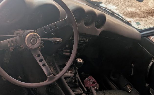 Inside, the cabin is somewhat well preserved. The original upholstery, dash, and switchgear remain in place, showing wear but also clear evidence of the claimed low mileage. Even the factory steering wheel and shift knob are present. A set of green covers protect the original seats, and the dash appears largely uncracked, which is rare for an early Z.