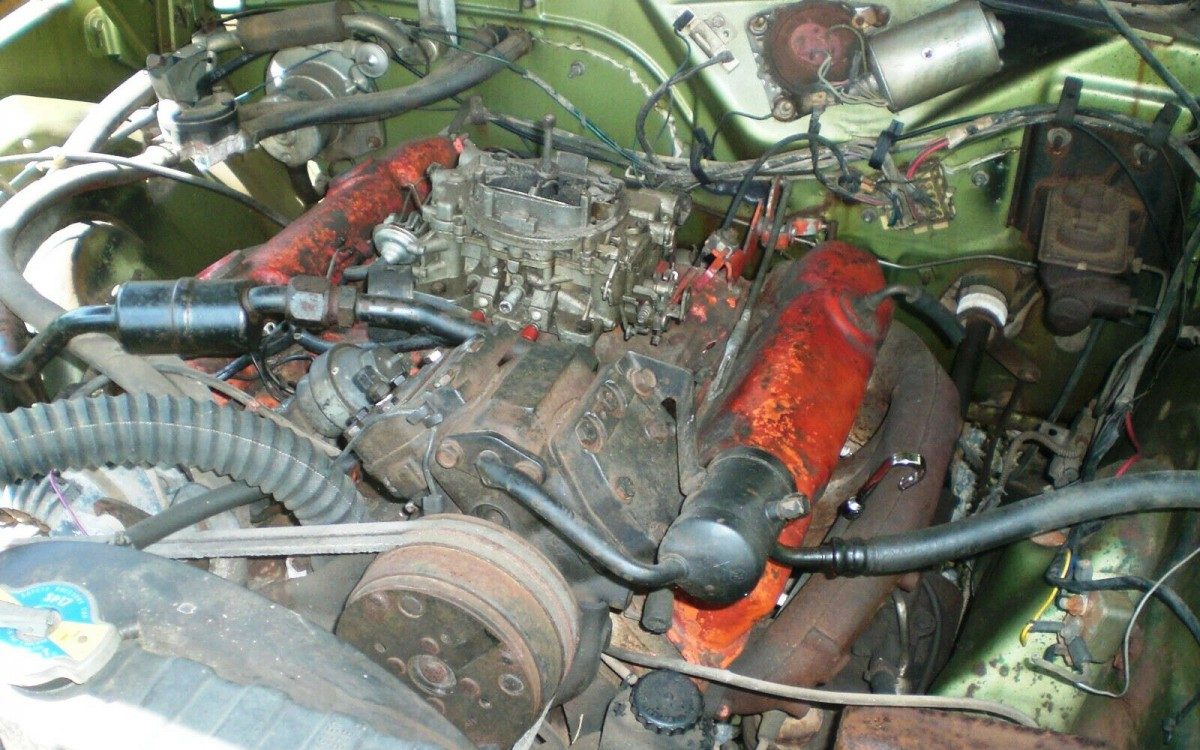 The original 383 (6.3L) is gone, and that’s unfortunate as (generally speaking) the largely pre-smog ’70s are the most desirable in this body style. As the evolution of the 383, this 400 (6.6L) from 1974 makes a good visual substitute. Though lower compression in stock form, the 400 has the largest bore of its day, bigger than the 440, and can be stroked to 451 cid (7.4L) with a 440 crank. How often do you see a rusty classic with a belt on the air conditioning compressor… in Ohio?