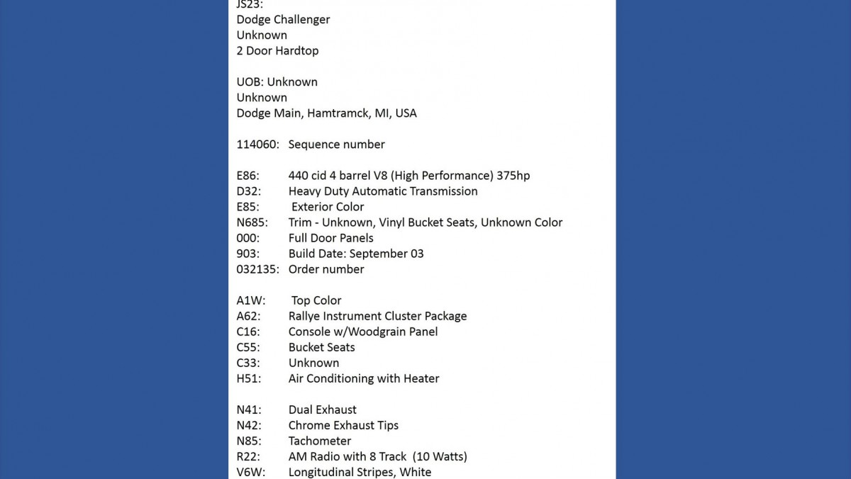 It’s unfortunate that part of the trim tag is obscured by dirt, but there’s enough here to whet some appetites. Unfortunately (or fortunately if you like mysteries) that “U” in the fourth group over on the bottom line raises some questions. According to this site that means the car should have a 440 V8 with a four-barrel carburetor, which is what it appears to have and what the dash tag says. However, this picture of the door tag on the car indicates a V code, which would mean a 440 V8 with three two-barrel carburetors, or the famed “6-Pack”. The seller calls out this discrepancy but feels it is a typo. Any readers hear of something like this before?