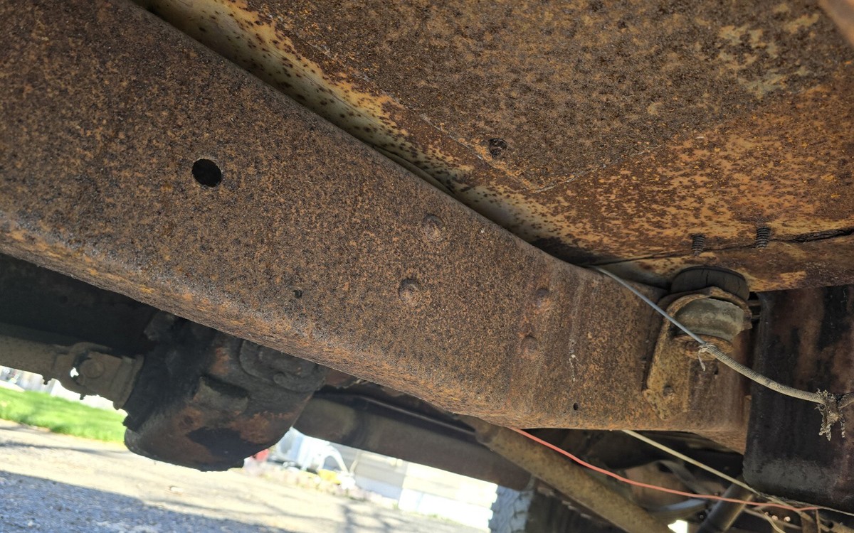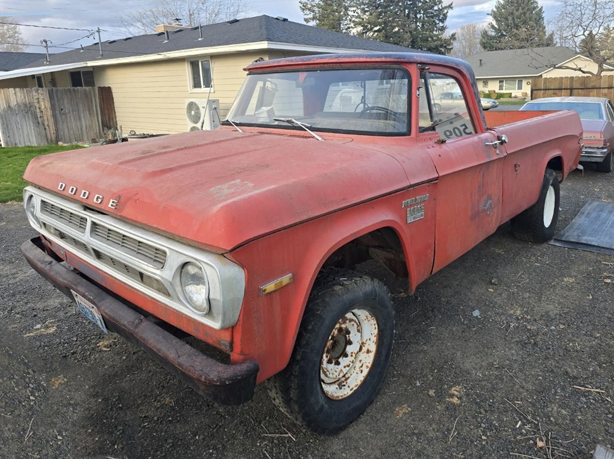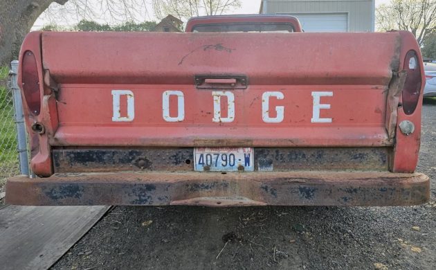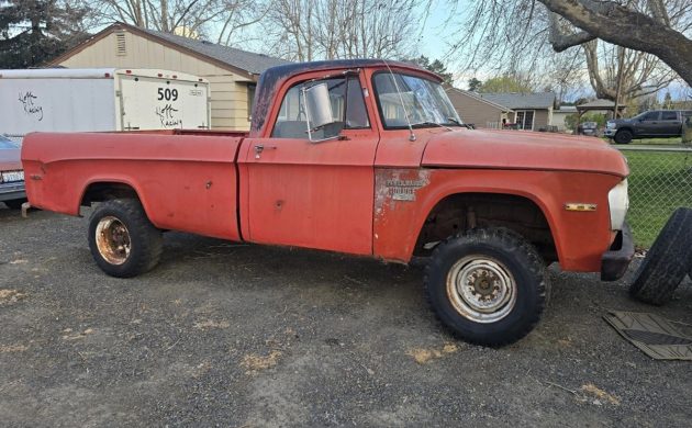 The second-generation D/W-Series Dodge pickups (D = rear-wheel drive and W = 4WD) were made from 1965 through 1971, and there’s a good amount of work to do on the body, as you can see. The seller says there’s rust on the floorboards, and the bed floor also has major work that’s needed. Other than some other minor rust and a dent in the lower left quarter panel, it looks pretty solid. The underside has heavy surface rust, but so does my underside.