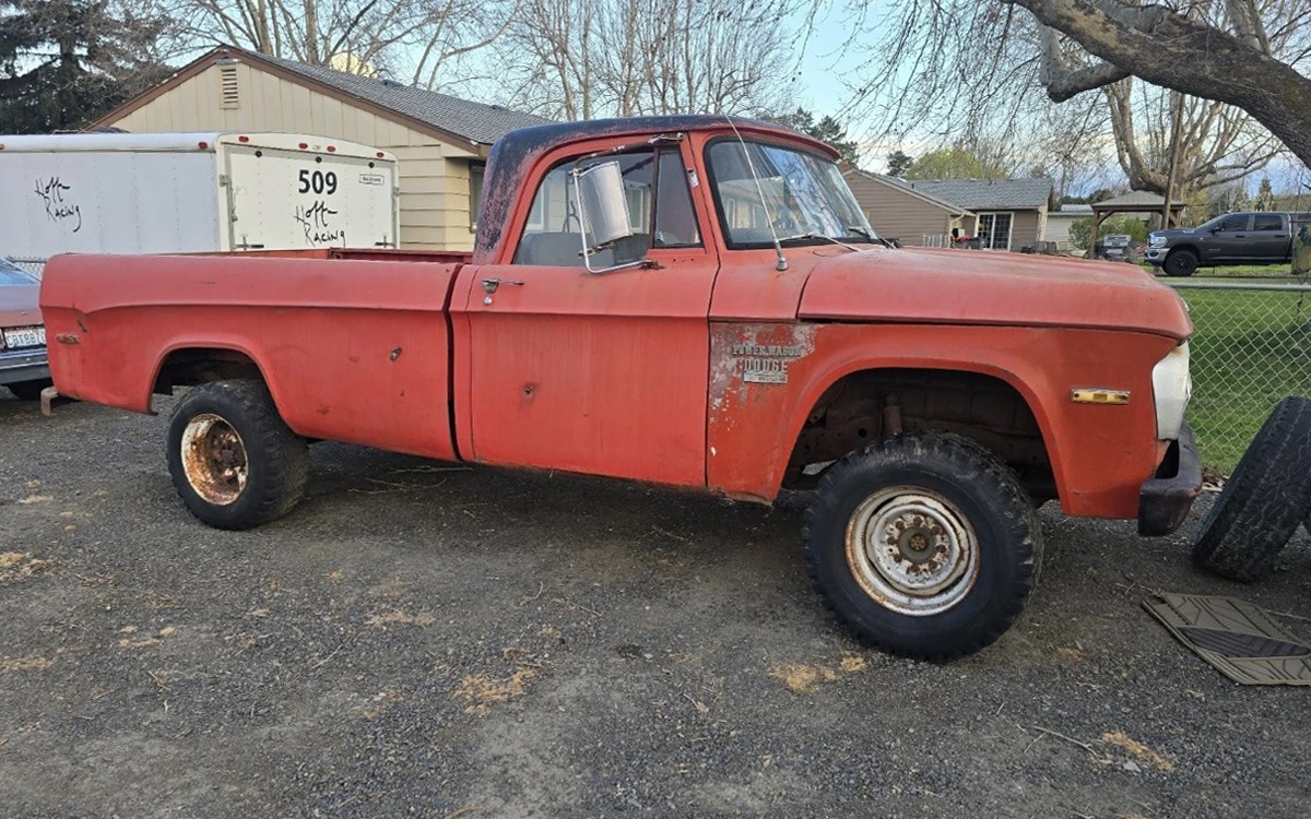With Dodge’s beautiful Sweptline box and single-eye (single headlight, one on each side) grille, this 1970 Dodge W100 Power Wagon looks like a great project pickup. A brochure for 1970 Dodge pickups says the Power Wagon 4×4 pickup is similar in appearance (I’m assuming, compared to the D100), other than “when looked at from dead ahead.” This one is listed here on eBay in Kennewick, Washington, and the current bid price is $810, but the reserve hasn’t been met.