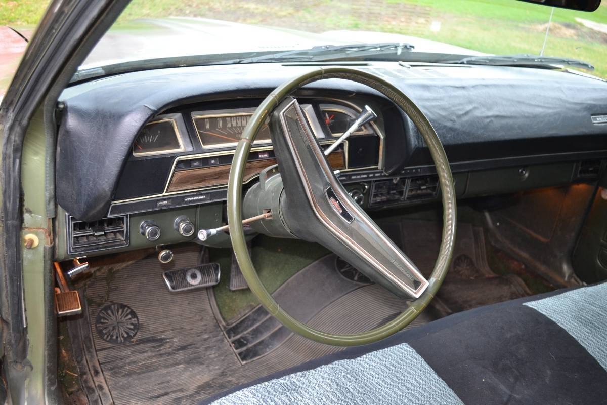 Looks like the previous owner may have had some vision problems. Like my ex-wife who “ Drove by Ear” when she hit something she turned the wheel. To me this looks like a decent $5k fixer upper. I love that it’s fairly solid mechanically and the body isn’t completely rusted off the frame and that someone hasn’t already loaded it with bondo yet but 4 me I’d need a Hurst and exhaust to the rear bumper. No problem with the Glasspacks. Sounds cool. Puke 🤮 Green just proves it was a product of the Muscle car Era ( Deduct 10%) and the green cloth… well it’s what I call the “ Kiss of Death, Deduct another 5%. $4,250- anyone?? You know this thing has to have more rust than it appears as the Video shows the owner has no problem with showing it’s from the North and driven in Salt and sand laced states.Ugliest grill with hide away headlights I’ve ever seen. Not sure why but it just doesn’t look right. Maybe with the headlights open it looks better? Still pretty cool 😎, because you know your ole lady would absolutely hate it and hate you even more just for paying 💰 for the sound of it.🤣😂.Hope it’s got a big trunk cuz that’s where my mattress would have to fit if I spent my ( Her) money on it.