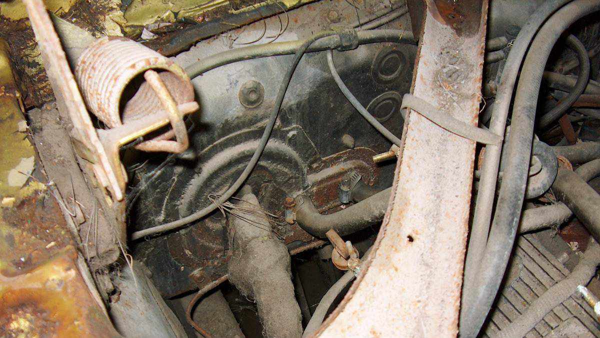 Here’s a close up of the underhood area around the passenger side hood hinge. I’m guessing that even if you stripped this car to the bare shell you’ll have a lot of rust to take care of. On the bright side, now that replacement shells are available you can get any stampings you need to restore this shell–if you think it’s worth it.