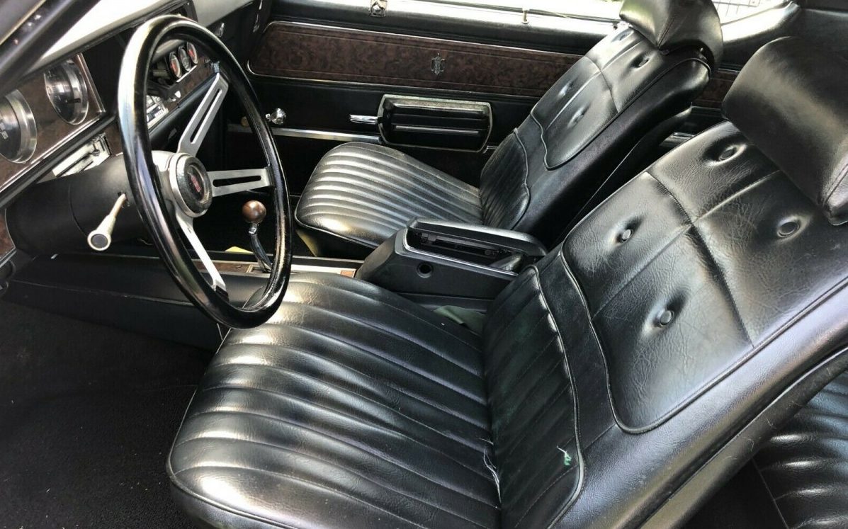 Under the hood is a 350 CI V8, 310 HP variety Oldsmobile engine. It appears to have had a distributor upgrade as well as an open-element air cleaner and chrome valve covers added. There is a brief statement claiming that this is a “great running car” but that’s probably a matter for further inquiry. I’m not sure what the purpose of the goofy looking heater-hose wraps is all about, a subjective styling cue, I guess. As usual, there is a three-speed, Turbo-Hydramatic, automatic transmission in place. While not muscle-bound like a 442, this Cutlass probably moves out in style.