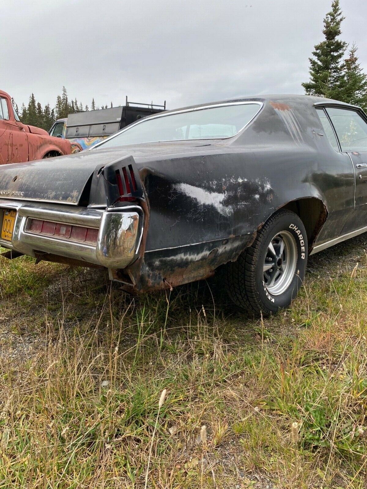 Due to competition from other GM brands, sales of the Grand Prix declined from 112,000 cars in 1968 to 65,750 Grand Prix in 1970. The interior of this black on black Grand Prix is worn out but still includes the unique 4-speed console. The black bucket seats are torn, faded, and ripped. Just about every panel on the car is damaged by dents or rust. It appears that the passenger rear corner was involved in a fender bender that has never been repaired.