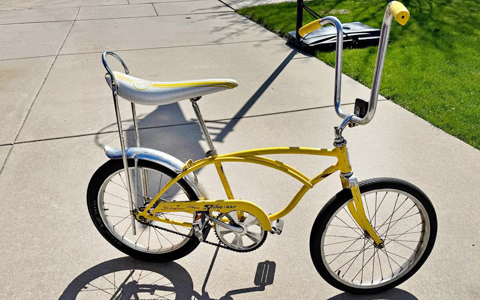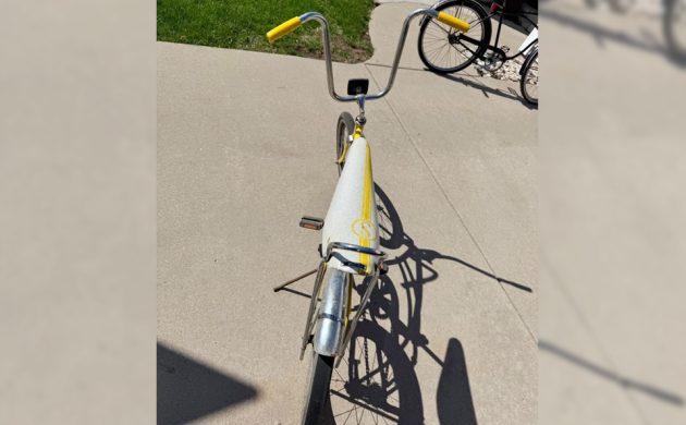 “The bike with the sports car look,” the Sting-Ray was Schwinn’s answer to custom bikes that kids in Southern California and elsewhere were creating on their own. 1971 is the first year a Lemon yellow Sting-Ray showed up in a Schwinn catalog, but the De-Luxe would have had “narrow-line” tires (a thin whitewall) and a yellow banana seat rather than white or silver as this one has. I’m guessing this is a 1972 or ’73 De-Luxe Sting-Ray, which by then was called Kool Lemon. A 1971 De-Luxe Sting-Ray coaster (single-speed) would have been $67.95, which is $554 today. Whatever year it is, it’s kool whether it’s a single-speed or not. Have any of you owned a single-speed Sting-Ray? What year do you think this one is?